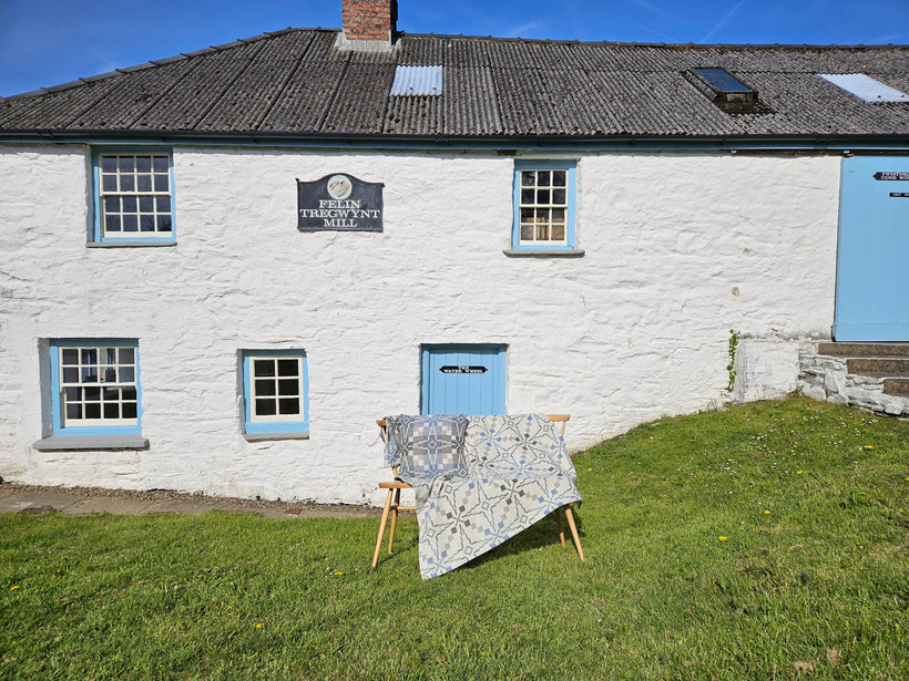 Our new Vintage Star Cynefin is more than just a beautiful design—it evokes the very heart and home of our craft: our mill. As we celebrate three years of being an Employee Ownership Trust, this blanket honours the place where it all began. The soft, calming shades of Vintage Star Cynefin are inspired by the iconic colours of our Grade 2 listed mill - white-washed walls, grey roofs, and blue trim, fondly known by us as Eluned’s Blue, after Eluned Griffiths. This historic building houses the history, heritage, and craftsmanship that define Melin Tregwynt.