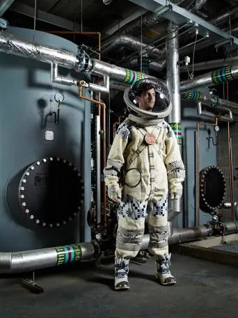 To answer that question, Jones turned to a local plumber, clog maker and stain glass artist and woollen mills to explore how their skills would work in a “cosmic context.” The result is a full-fledged space suit made solely from Welsh materials and using traditional craftsmanship.